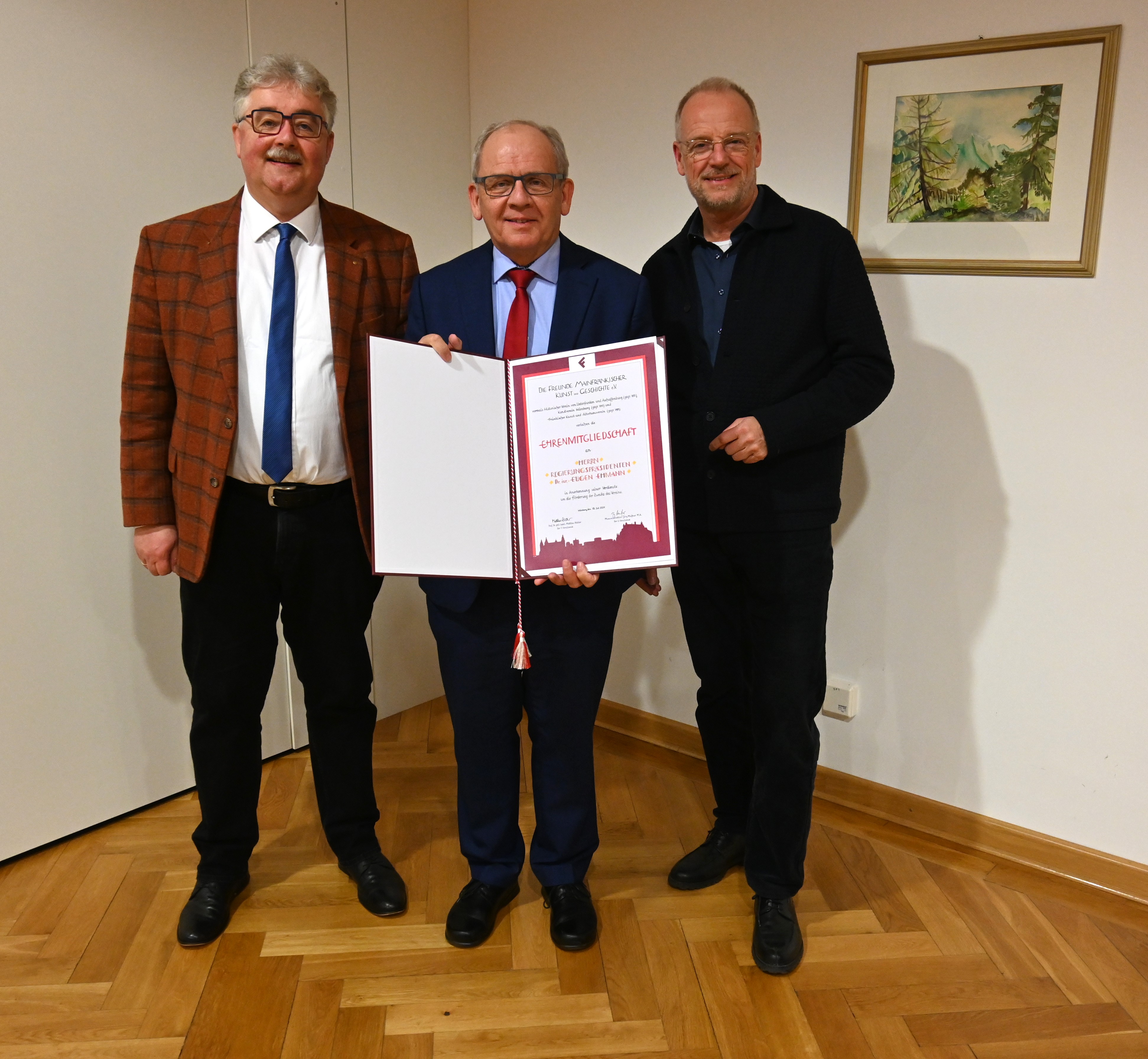 Bereits auf der Jahreshauptversammlung 2024 war einstimmig dem Antrag zugestimmt worden, dem früheren Regierungspräsidenten von Unterfranken, Dr. Eugen Ehmann, die Ehrenmitgliedschaft der Freunde zu verleihen. Die diesjährige Versammlung bot nun den idealen Anlass zur Überreichung der Urkunde. Der 1. Vorsitzende würdigte hierbei das besondere Interesse Ehmanns an der Geschichte und Kultur Mainfrankens und seinen unermüdlichen Einsatz für die Freunde, den er auch im Ruhestand fortsetze.