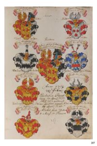 Hier wird zwischen den Wappen der Adeligen, die aufgeschworen wurden, und den Wappen, die zum Nachweis des Stammbaumes gehörten, unterschieden.