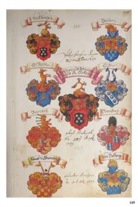 Für jedes Wappen wurde ein Datensatz angelegt, der auf der Unterseite „Wappenbuch“, welche auf unserer Seite „Sammlungen“ steht, und auch über den Link oben zu finden ist. Für jeden Datensatz wird dabei die Seite des Wappenbuchs gezeigt, auf der sich das entsprechende Wappen befindet. Deshalb taucht das gleiche Bild immer mehrfach für alle Wappen derselben Seite auf.